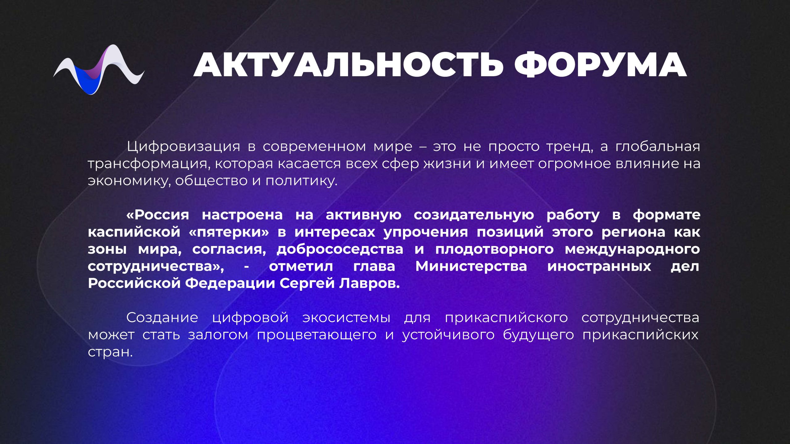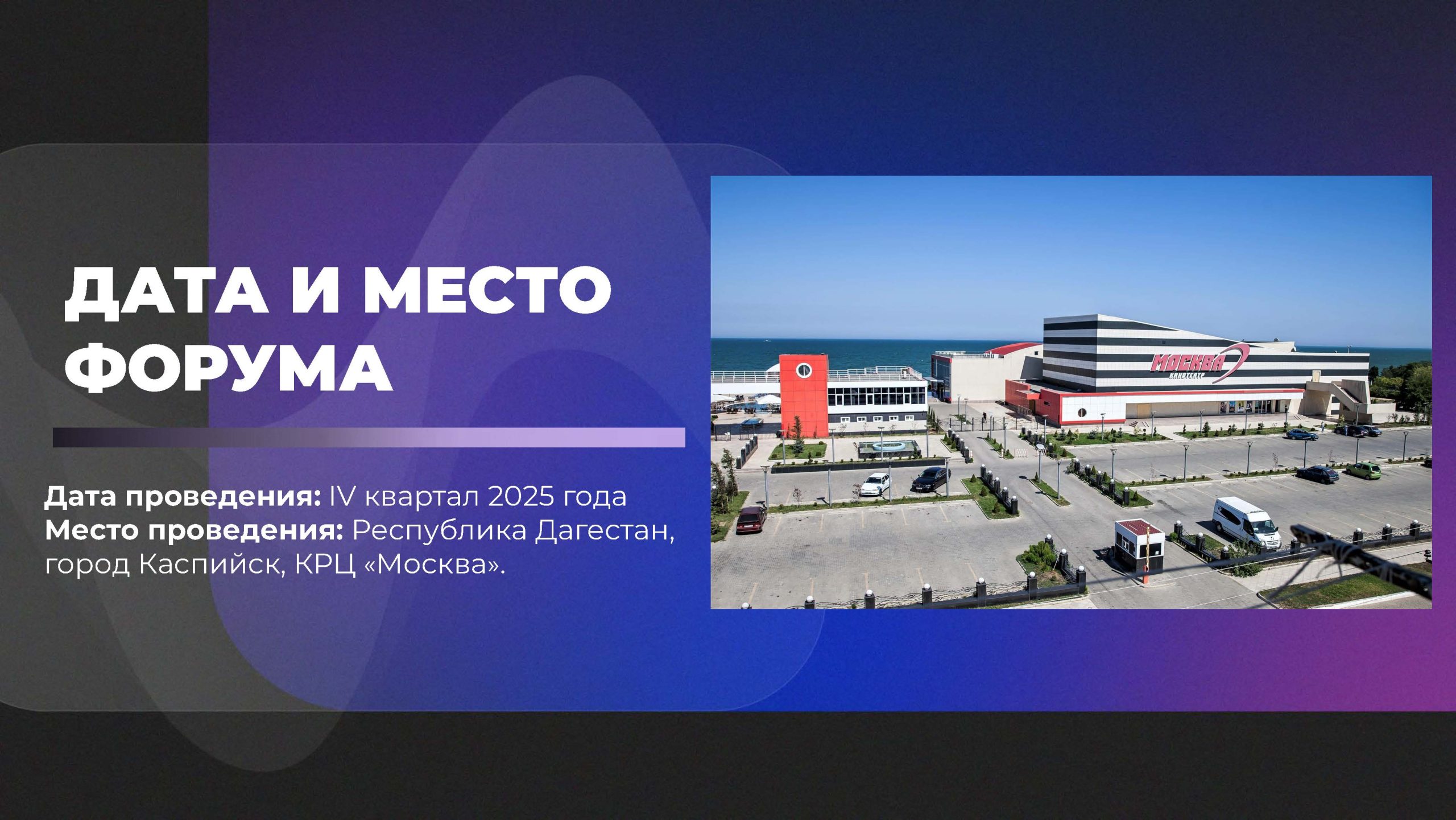 30–31 октября 2025 года в городе Каспийске (Республика Дагестан) состоится III Международный Каспийский цифровой форум — ключевая площадка деловой коммуникации между Россией и странами Прикаспийского региона. Форум объединит представителей органов власти, бизнеса, научных и экспертных сообществ для обсуждения актуальных вопросов цифровизации и укрепления международного сотрудничества в этой сфере.